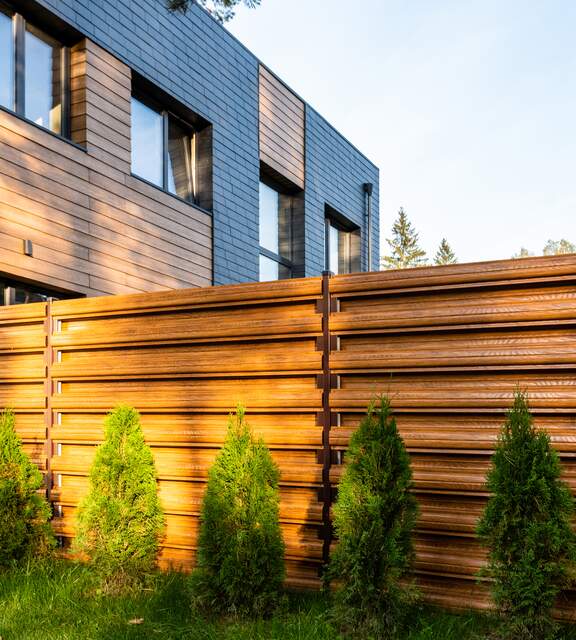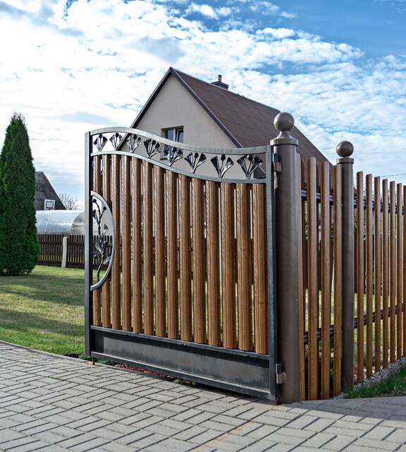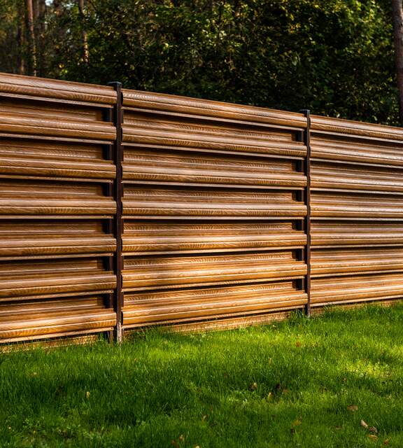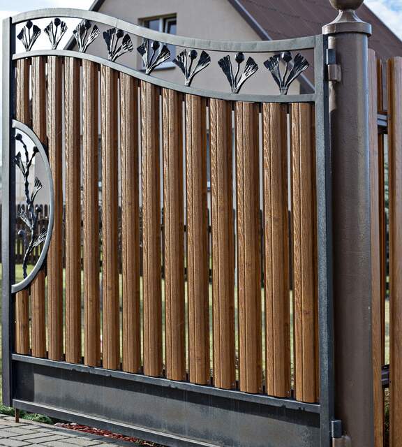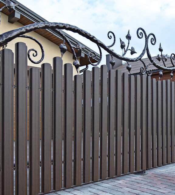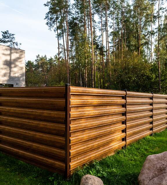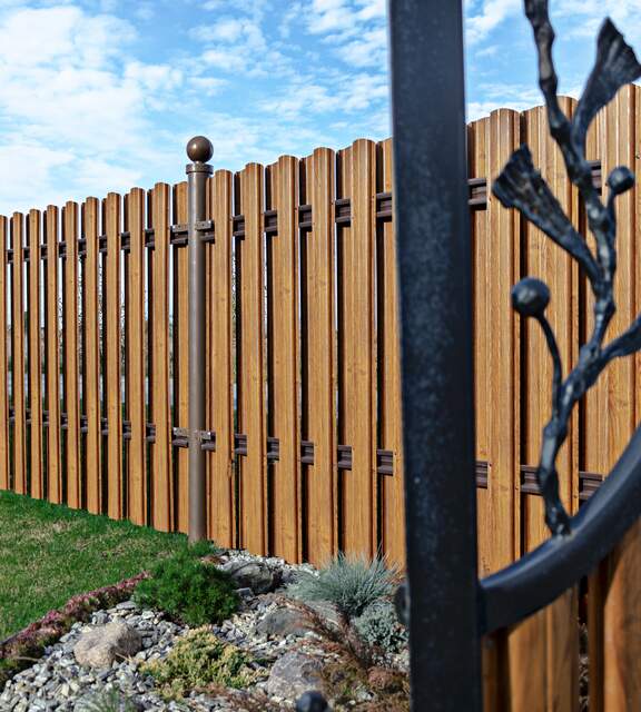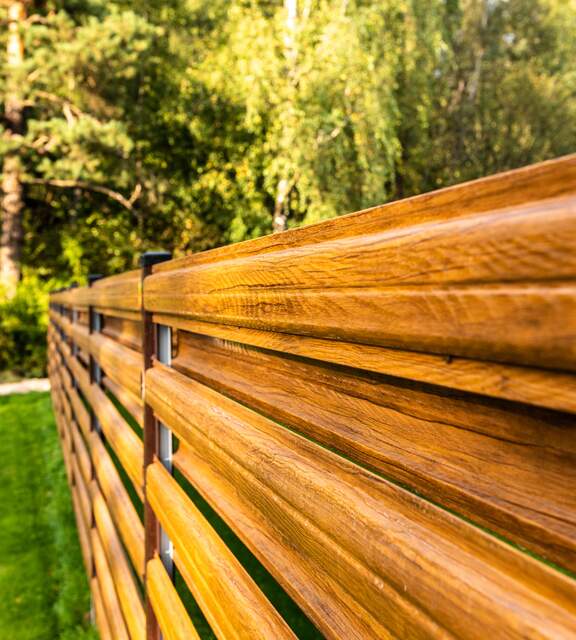 Wood-look metal pickets combine the aesthetics of traditional fencing with durability and low maintenance costs.